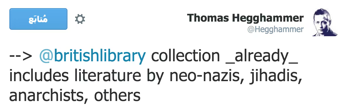 But despite hopes that the library would host a master copy of the digital collection, it got cold feet at the last minute, telling the project’s organisers that they feared they could be in breach of Britain’s increasingly stringent counter-terrorism laws. (LINK)