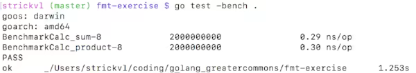 Benchmarking worked fine. Go’s benchmarking tools figure out how many times they need to run a particular function in order to properly test it. In my case, each function ran two billion times for an average of 0.29 and 0.3 nanoseconds per iteration. Pretty fast! I have no baseline for knowing how fast that is, but it seems fast to me. Of course, the function isn’t doing anything particularly taxing.