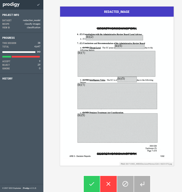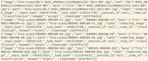It took about three hours to annotate some 4600+ images. Then I could export a .jsonl file that contained the individual annotations for whether a particular image contained a redaction or not: