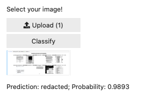 Using MyBinder and the voila library, alongside instructions from the book and the forums, I managed to get my model deployed. If you visit this address you’ll see an interface where you should first upload an image — i.e. a screenshot of a document. When you click ‘classify’, you’ll then see a prediction of whether the image is redacted or not, as well as the confidence/probability that that prediction is true.