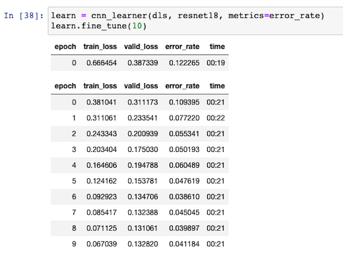 learn.fine_tune(10)The images get resized to 224x224 pixels, since this is the size that the resnet architecture expects. Since we have a good deal of labelled data, I’m comfortable using 80% of that data to train the model and the remaining 20% against which to validate.