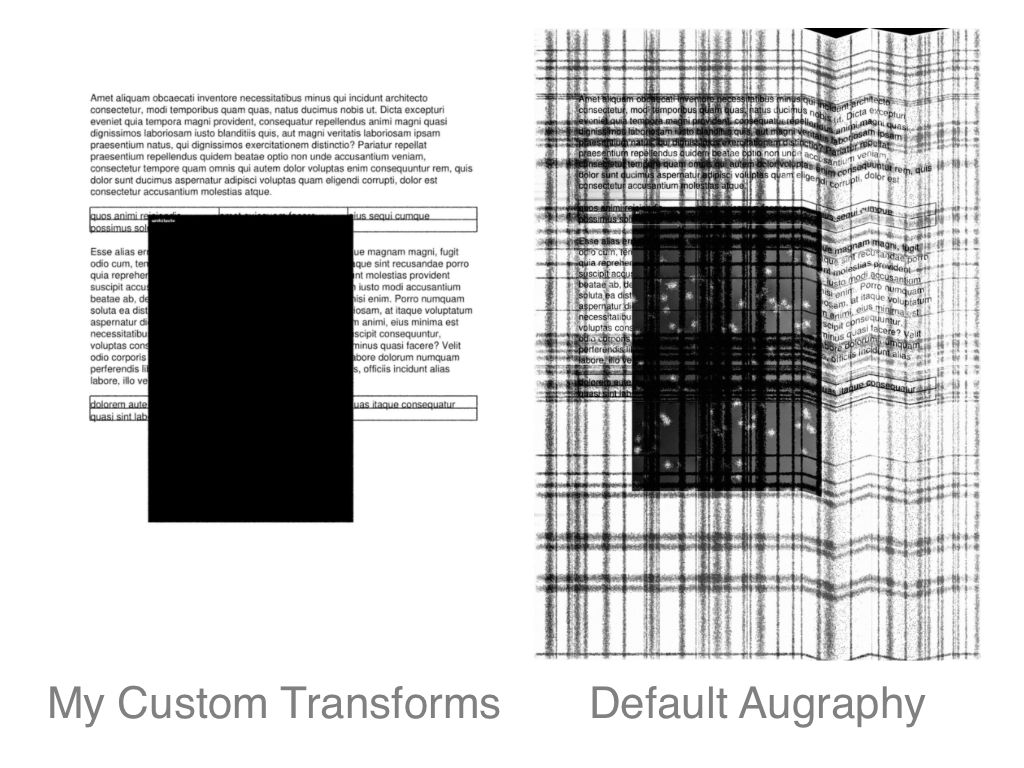 Not only did the default Augraphy transforms often make the redaction indistinguishable, it shifted parts of the image around on the page for these crinkle and scrunch effects, which would have rendered my annotations inaccurate.