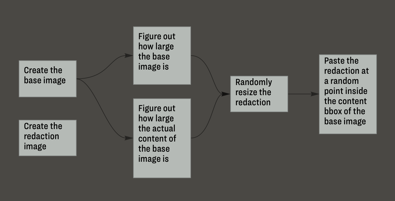 The redactions weren’t quite as easy as the base images. The easiest version of a redaction box was literally that: a black box that sits on top of the base image. That much was easy to create. Pillow had some useful interfaces that I could use to quickly create randomly sized boxes. I could even add text to them in the upper left corner as I’d noticed that many of the real redactions did that.