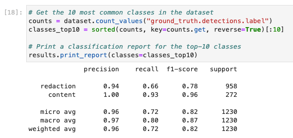 Scrolling through the examples with high numbers of false positives and false negatives gives me a really useful indication of which kinds of redactions with which I need to annotate and supplement my training data. I already had a sense of this from my own intuition, but it’s excellent to see this confirmed in the data.