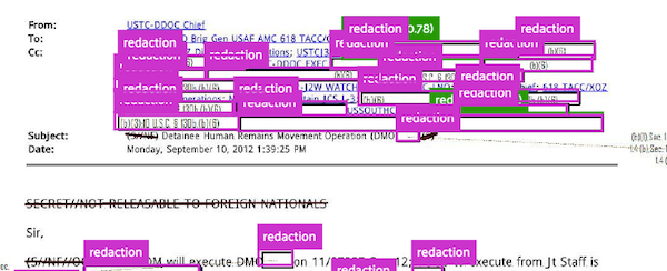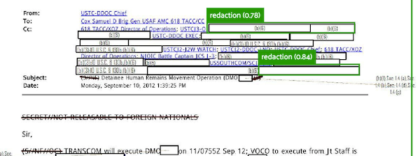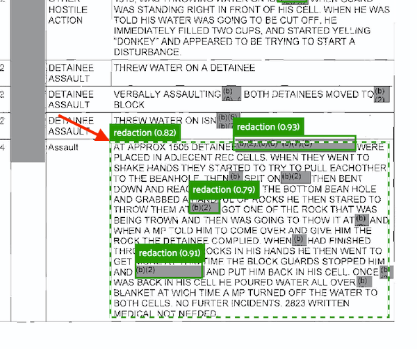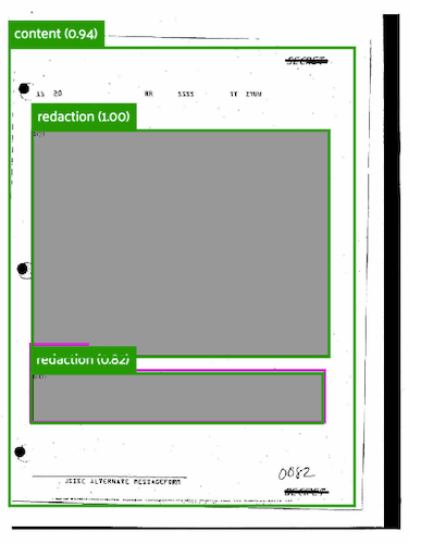 In this image you can see that the model predicts a redaction box with 82% confidence that is clearly not a redaction. Note, too, how the smaller redactions to the right and the large partial redaction to the left were not detected.