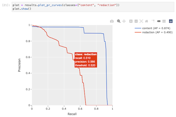We only have two classes in our training data: redaction and content, so doing a class analysis doesn’t help us too much for this problem, but using the mean average precision (MAP) calculation we can see the difference between how well our model does on redactions vs content: