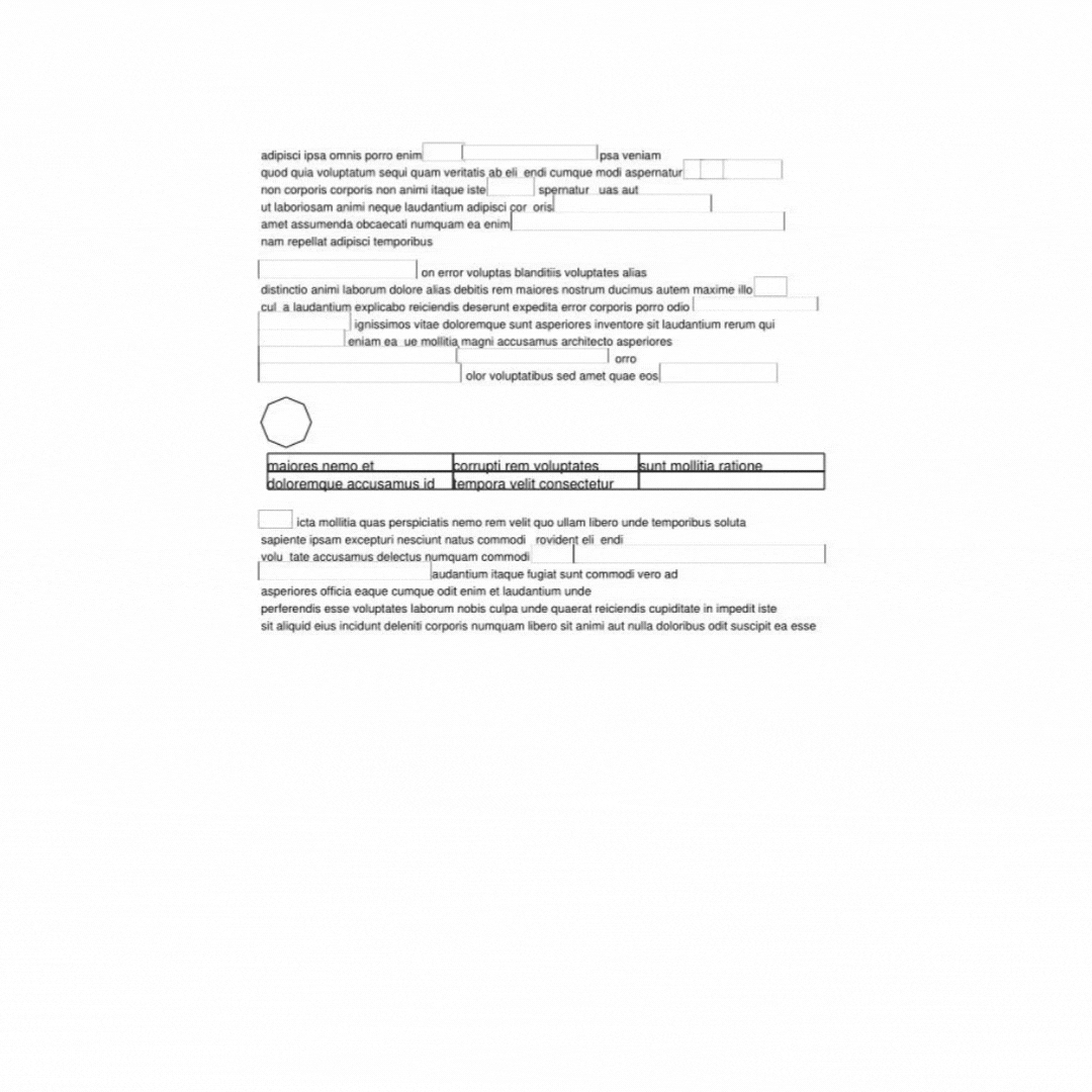I decided to try creating a separate batch of synthetic image data, this time fully tailored to tackling some of the hardness mentioned above: it would have many small redactions on a single page, they would all be white boxes and there might also be things like tables with white box-like shapes coexisting next to redactions.