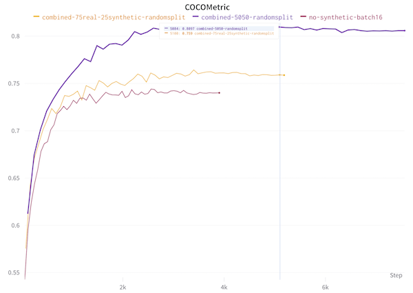 In this chart, at the bottom you can see how training the model without the synthetic data (no-synthetic-batch16) performed. Ok, not great. Then the next best performing (combined-75real-25synthetic-randomsplit)was when 25% of the total number of images was synthetic, and the rest were real manually annotated images. At the top, with around an 81% COCO score, was the model where I used 50% synthetic and 50% real images. This seemed to fit what my intuition said would happen.