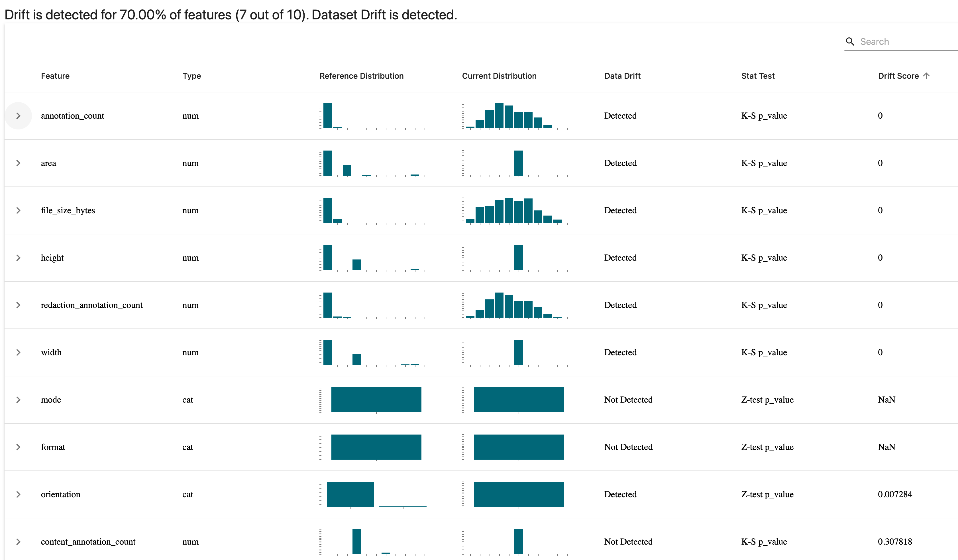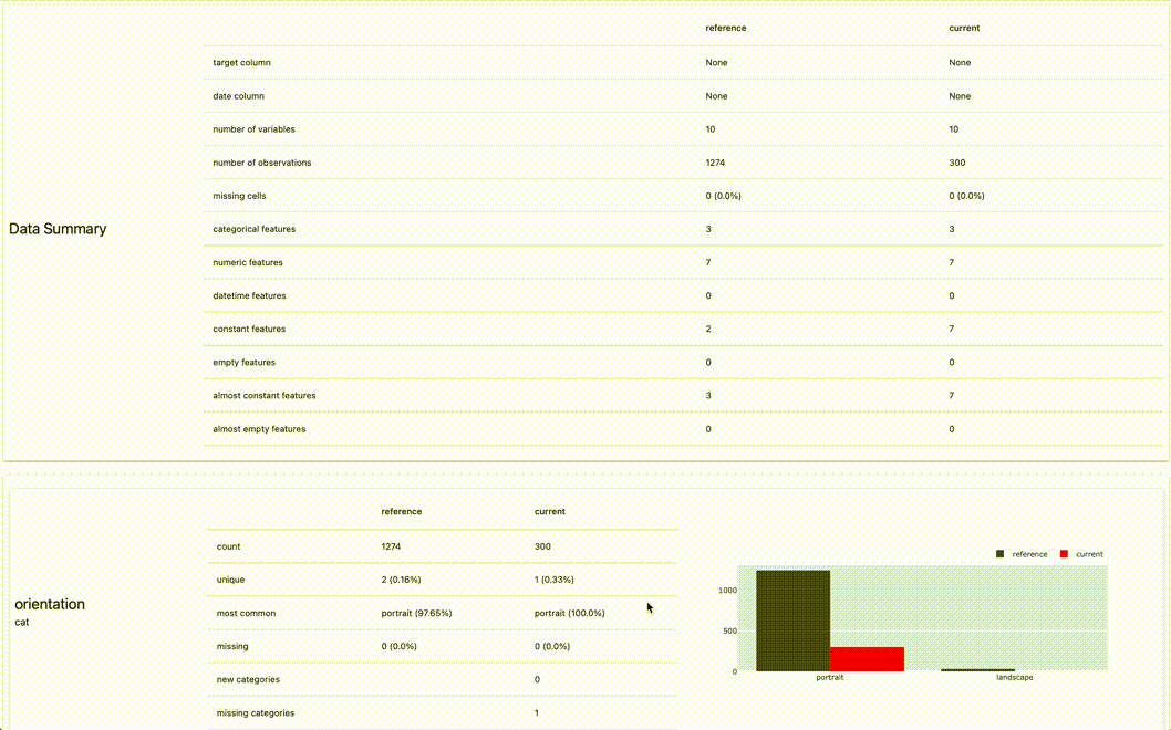 It doesn’t surprise me too much that we have this disparity, since the only annotations that are portrait in the synthetically-generated set are those for the content box around the whole page. All the rest are landscape, and that’s by design. (Note: you can make the comparisons using different statistical tests depending on your use case. I’m told that the next Evidently release will increase the number of available options for this.)