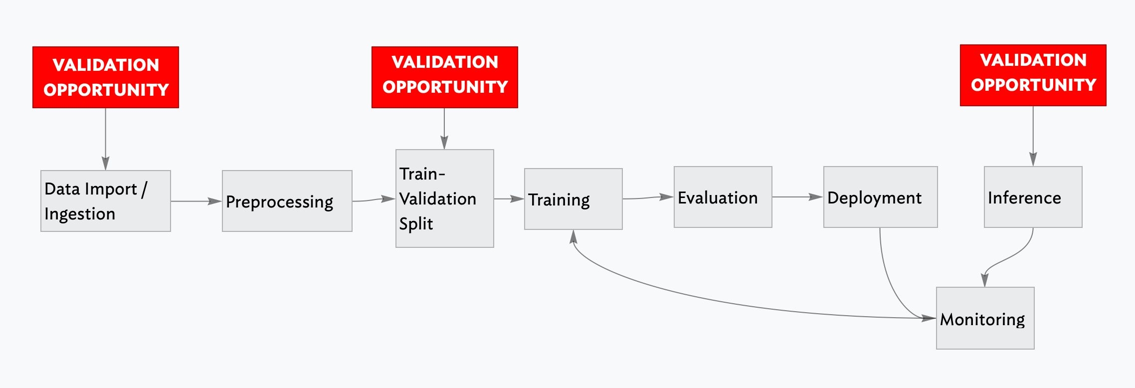 ⏰ You’ll also want to think about when you’re doing your validation. Two key moments stand out for machine learning projects: when you’re ingesting data prior to training or fine-tuning a model, and at the moment where you’re doing inference on a trained model.