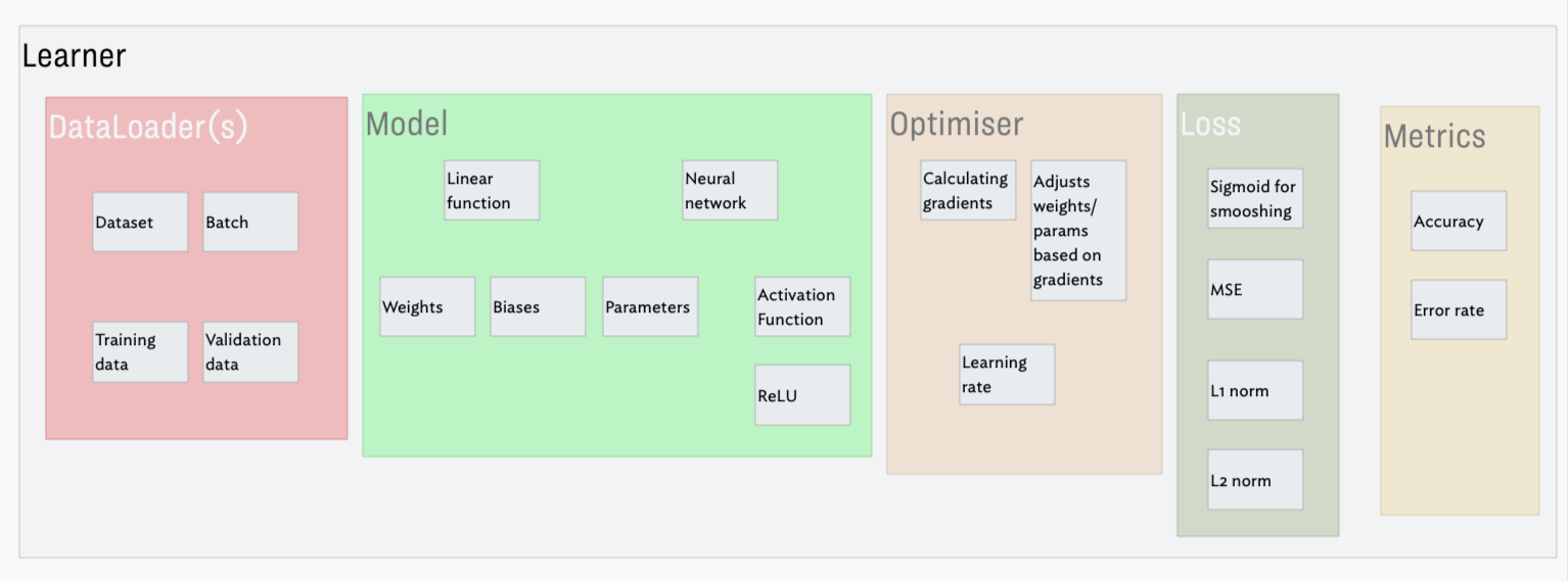 Finally, to round out my understanding, I put together a little diagram showing the various pieces that go into the Learner class when we instantiate it, adding some of the other concepts etc below it as I felt was appropriate. This isn’t a complete picture by any means, but I find it helpful to visualise how things are layered and pieced together: