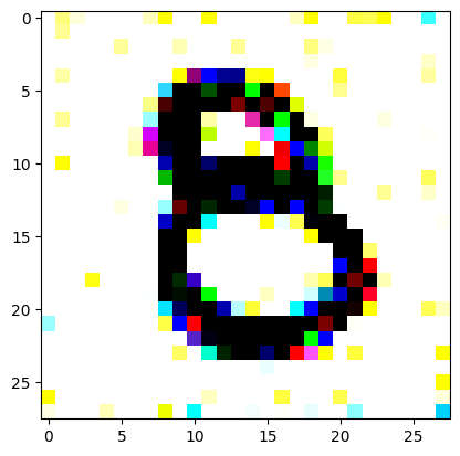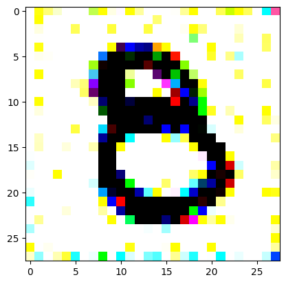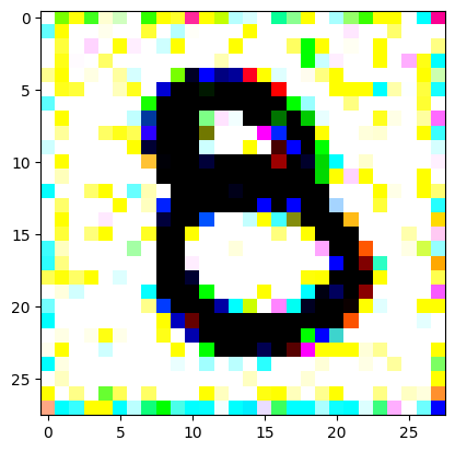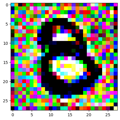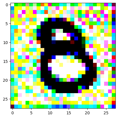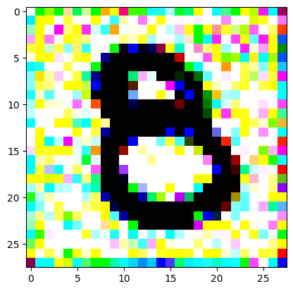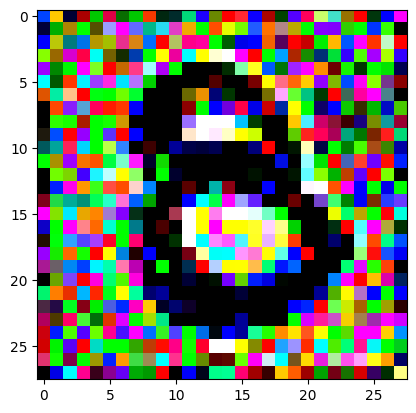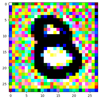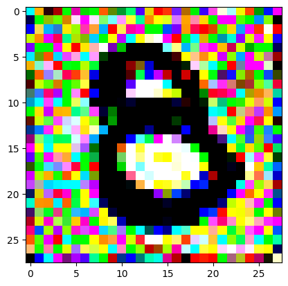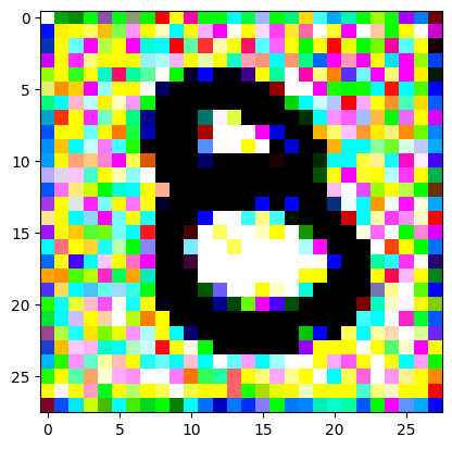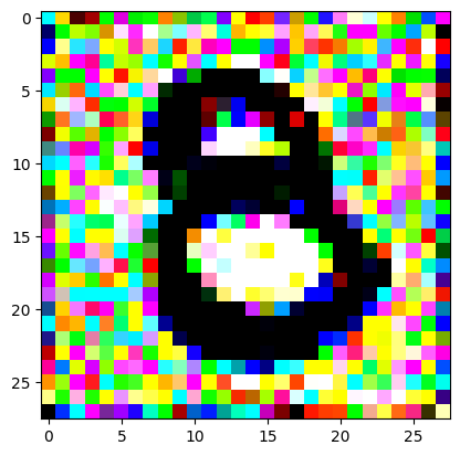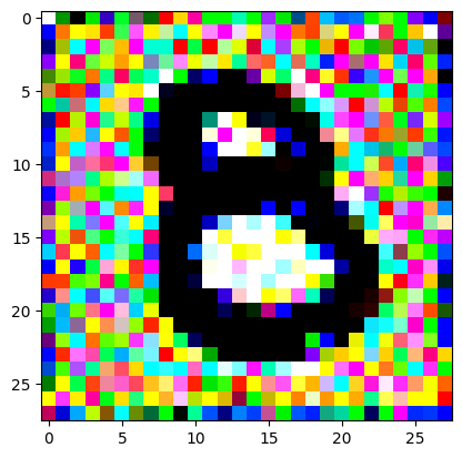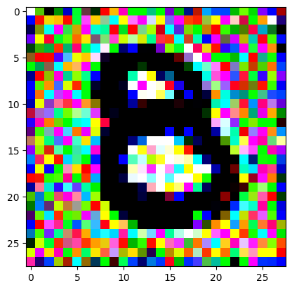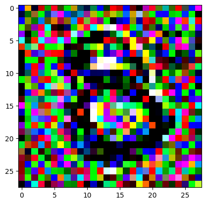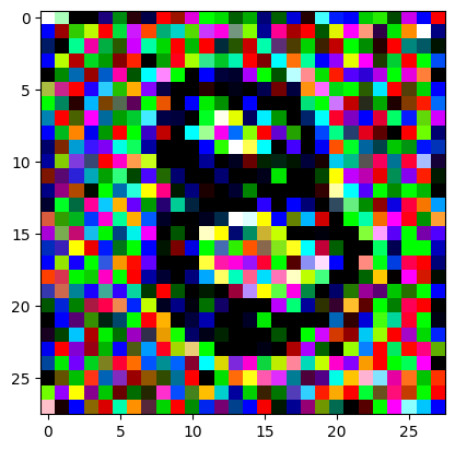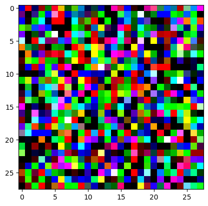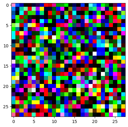 # we generate a 3x28x28 tensor with random values assigned# we ensure that we can use PyTorch's autograd on the valuesdef get_noisy_starter_tensor() -> torch.Tensor:return torch.randn(3, 28, 28, requires_grad=True)# this will allow us to display the tensor as an imagedef display_tensor(tns: torch.Tensor):# Convert the tensor to a NumPy array image_array = tns.detach().numpy()# Clip the pixel values between 0 and 1 image_array = np.clip(image_array, 0, 1)# Transpose the array to (28, 28, 3) shape image_array = image_array.transpose((1, 2, 0))# Display the image using Matplotlib plt.imshow(image_array) plt.show()