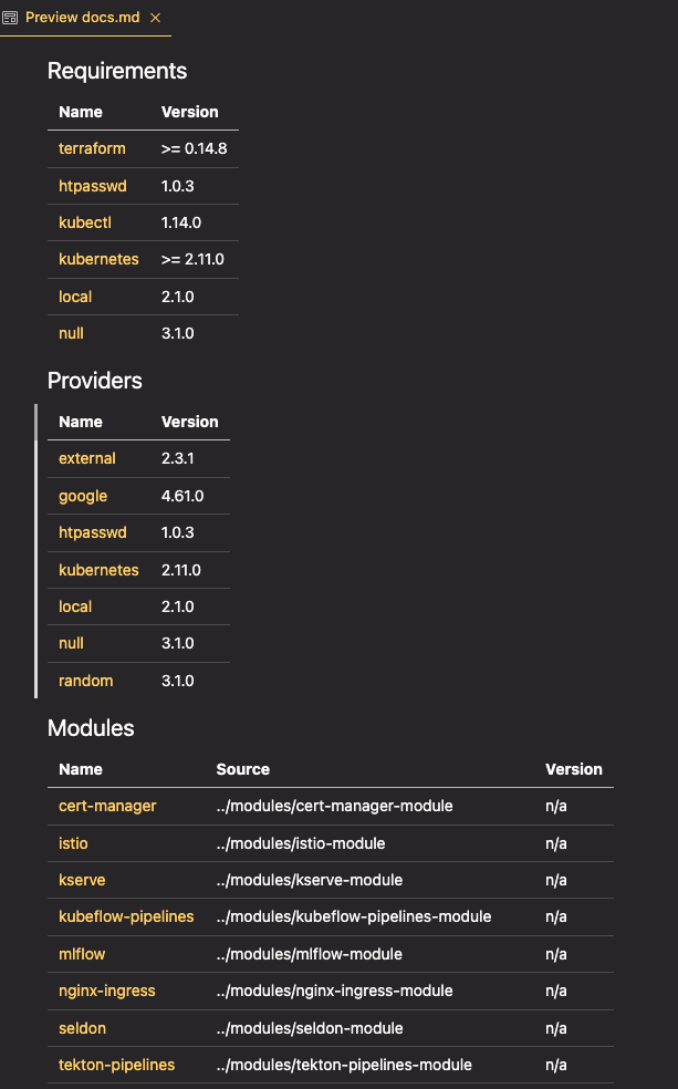 If you’re lucky and whoever wrote the terraform code has taken care to write descriptions for variables and the various modules being used, the next tool might prove quite useful. terraform-docs is a way to generate module documentation via a CLI command. Once you’ve installed it, running the following will give you a markdown file that you can preview to learn more about your codebase: