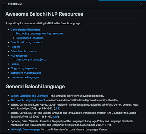 The awesome-balochi-nlp repository is my first effort at gathering a list of resources. I’ll be keeping it up to date as I continue.