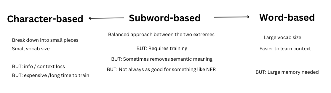 When it comes to language, the things we care at the tail end of all our modelling all relate to sequences of words and not characters. While our vocabulary (i.e. our list of unique characters) would be pretty small with character-level tokenization, we’d have some other issues: