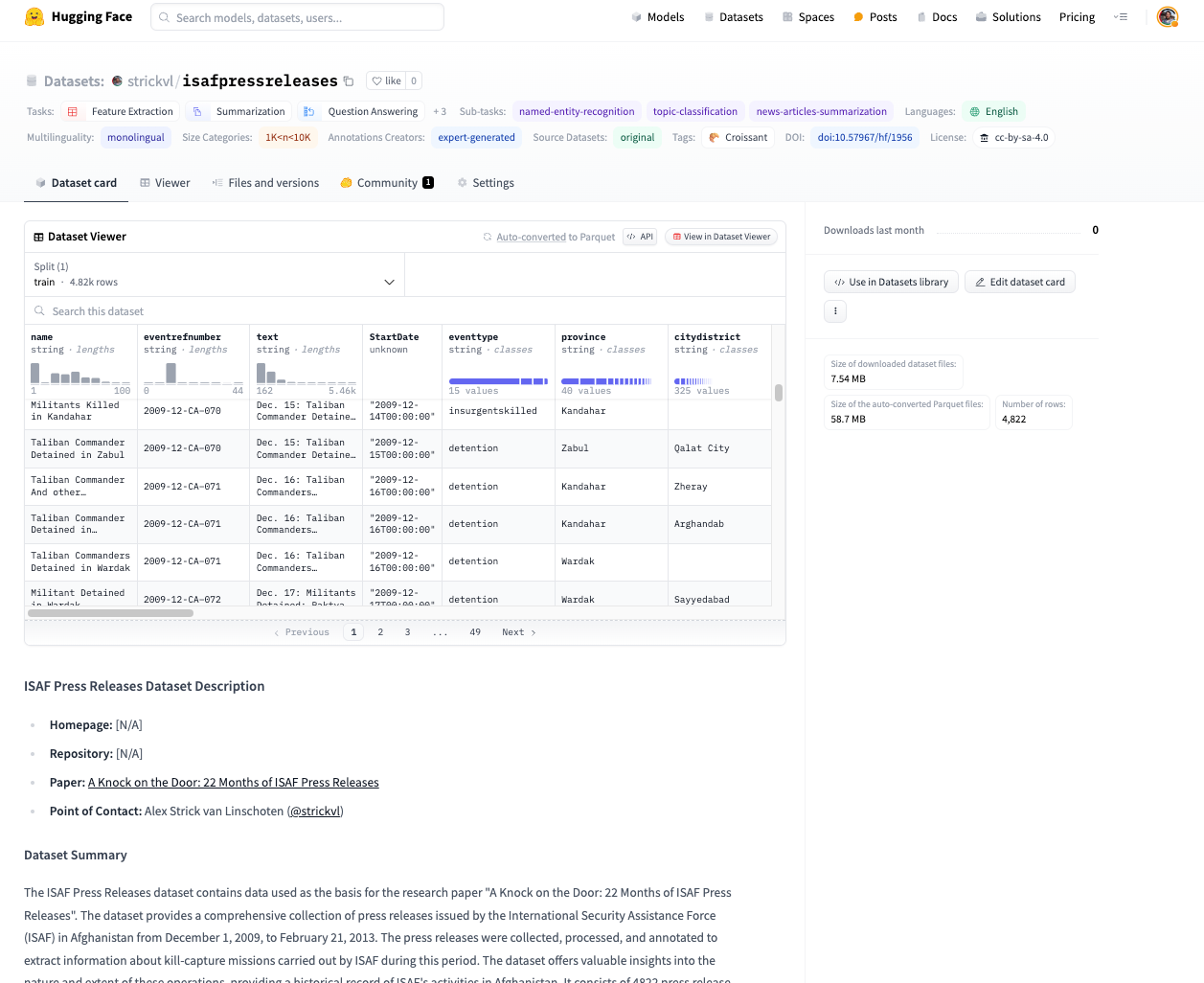 - The data is hard to come by now since ISAF and NATO took down the original website and files. I’ve had researchers contact me asking for the data over the years so now I’m making it available as a public dataset on the Hugging Face Hub.