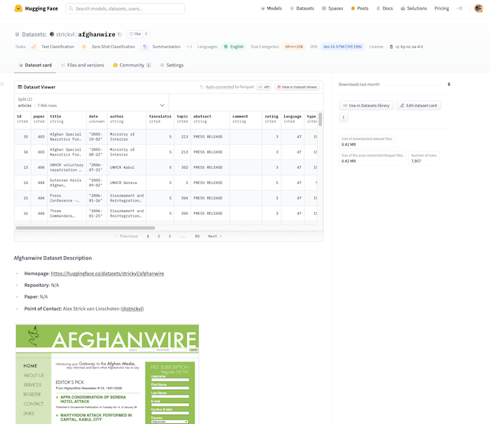 The Afghanwire Dataset is now available on the Hugging Face Hub under a Creative Commons Attribution-ShareAlike 4.0 International (CC BY-SA 4.0) license. Researchers and interested parties can access the dataset here.