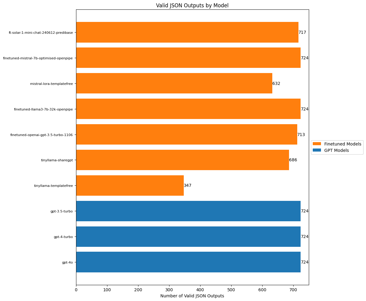 Our top performer was Mistral-7B (finetuned on OpenPipe), very closely followed by Solar LLM and Llama3-7B. Just looking at the scores above it seems like anyone finetuning models for structured data extraction would do well to start of with Mistral-7B, Solar 7B or Llama3-7B and then see which performs best, though with the caveat that they might all be more or less the same for accuracy. There are probably different tradeoffs when it comes to serving the model and the efficiency and latency there, but still these three do really well.