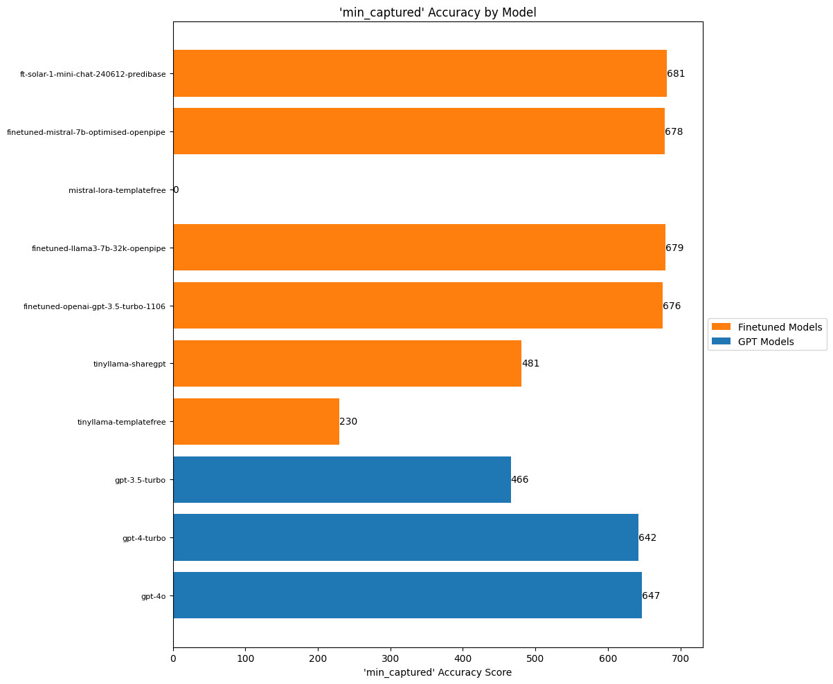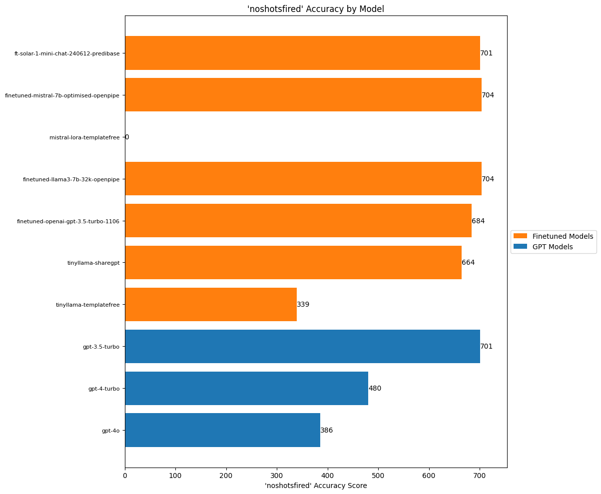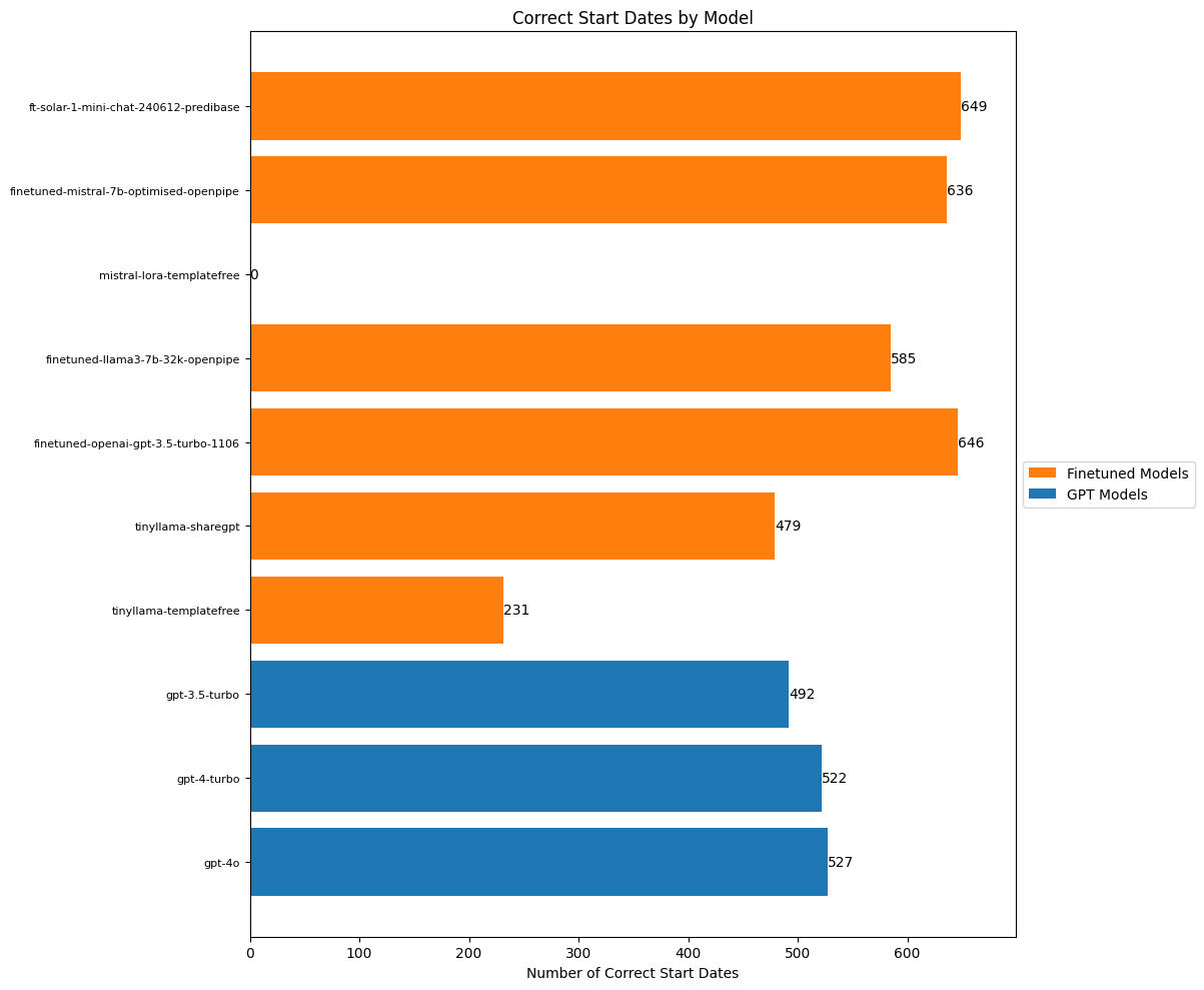 We often hear about how LLMs are bad with numbers, how they default to certain values and so on, so I was surprised to see such high scores across the board for this task. I imagine this is something that everyone has been trying to improve and it shows. Still, though, our finetuned models do best.
