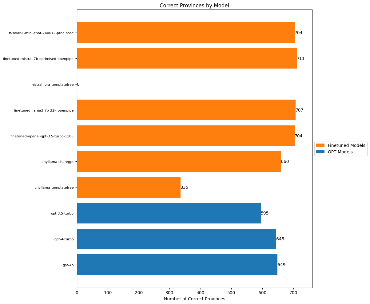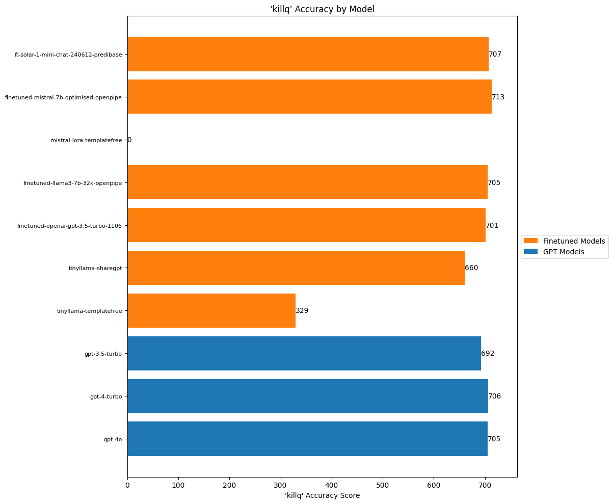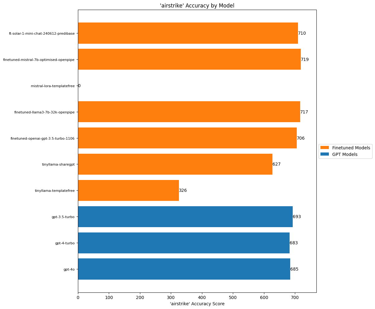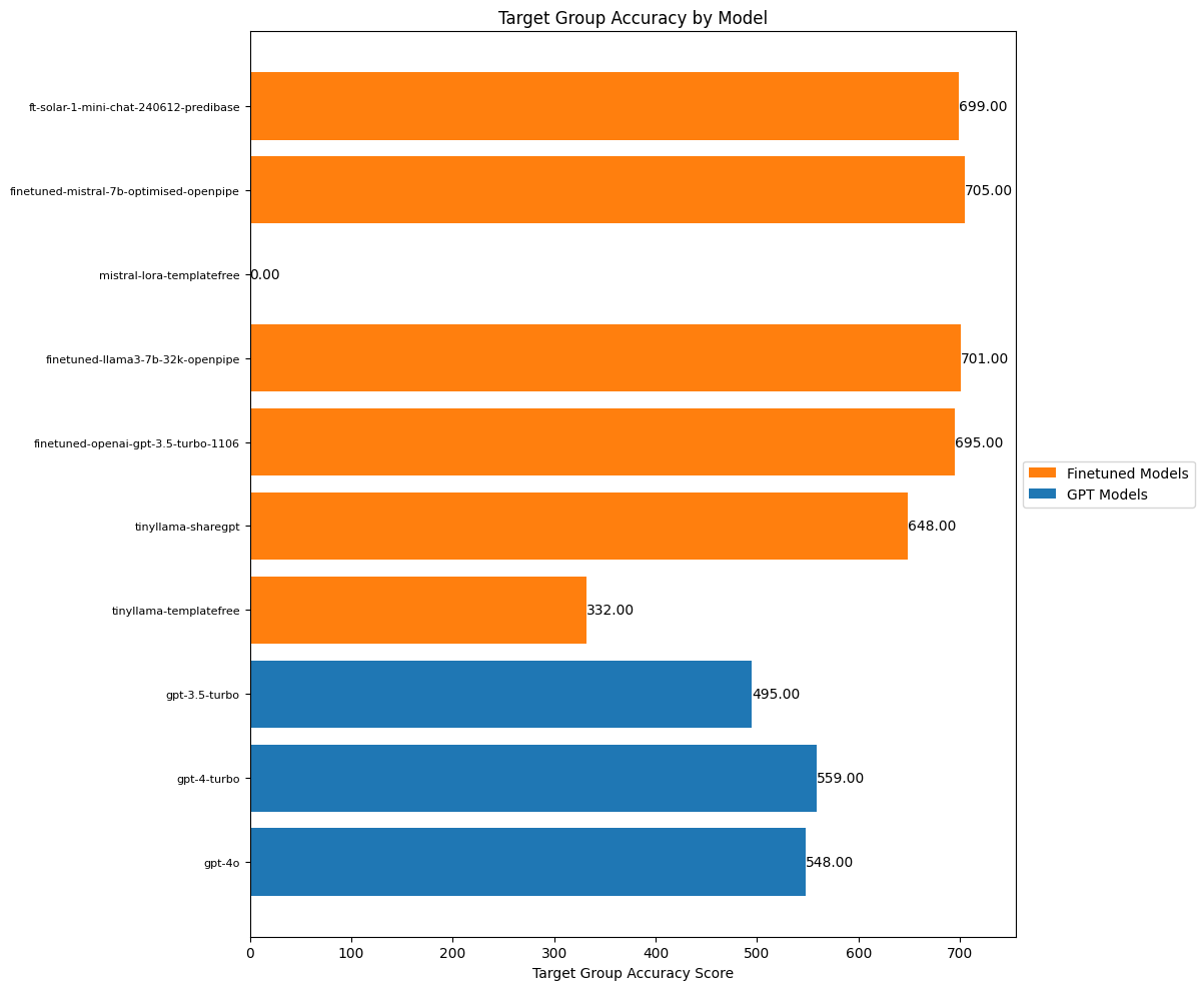 We often hear about how LLMs are bad with numbers, how they default to certain values and so on, so I was surprised to see such high scores across the board for this task. I imagine this is something that everyone has been trying to improve and it shows. Still, though, our finetuned models do best.