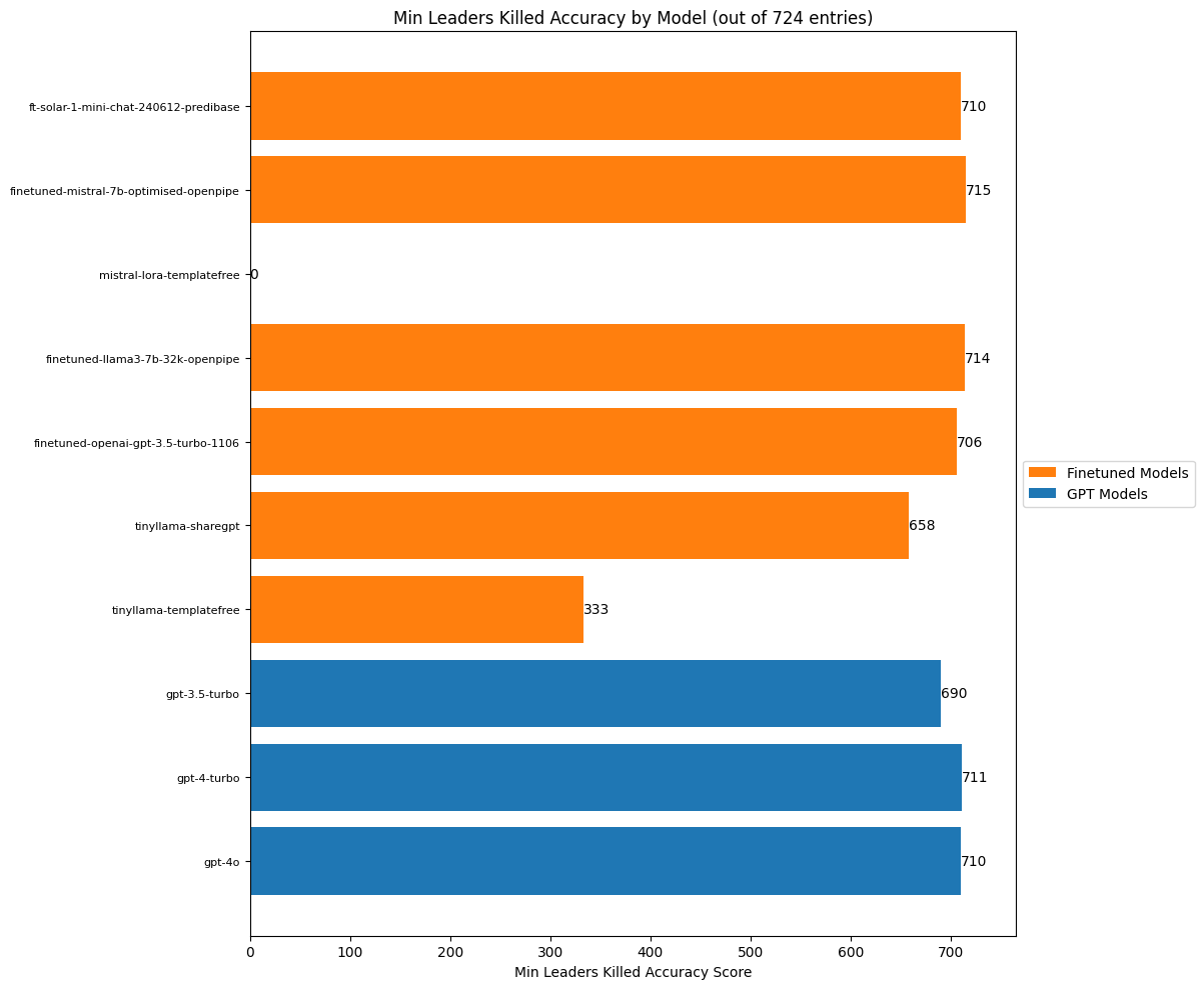 title=f"Min Leaders Killed Accuracy by Model (out of {total_entries} entries)",