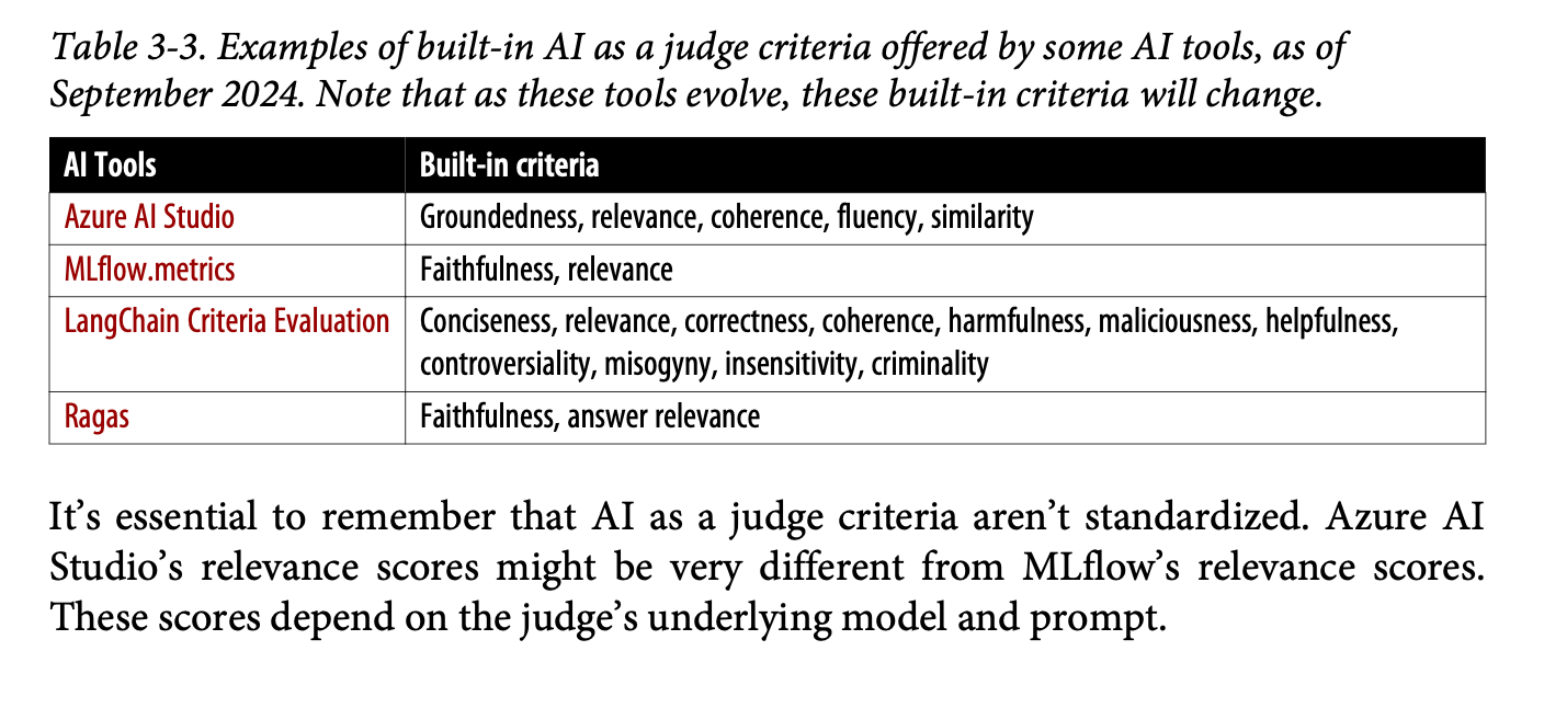 - Table 3-3 (page 139) provides an overview of different AI judge criteria used by various AI tools