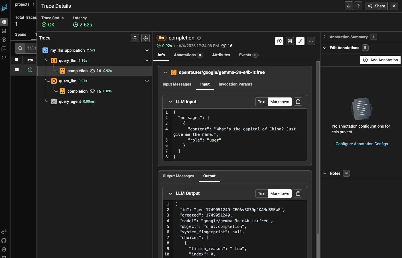 As you can see, we’ve captured the input and output messages for the completion, it’s tracked the latency of the call (1.16s, which seems pretty slow actually!). There is also some sort of an annotation interface though I’ll explore that down the line maybe. I immediately notice that I’m missing things like the system attributes for where the call was made, also metadata like the temperature and other settings. I’d also like to see things like token counts (which you can get in Phoenix but they’re sort of buried) as well as the estimated cost of the call(s) and so on. We can see about adding some of that down the line.