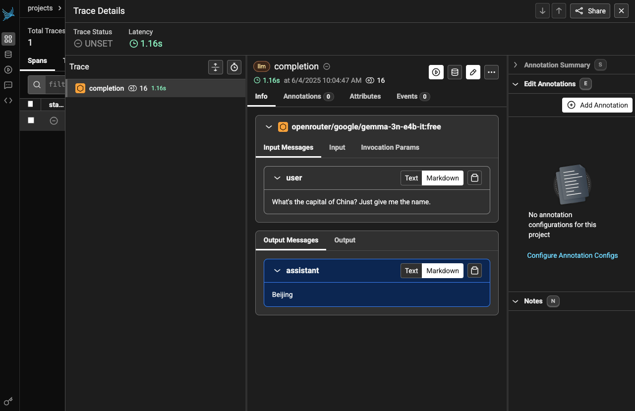 print(completion_response.choices[0].message.content)This achieves a similar result, though I was unable to get the trace to land anywhere other than the default project. Arize’s docs mention a PHOENIX_PROJECT_NAME environment variable but it seems this isn’t respected or used by the litellm implementation. Indeed when I look at the implementation, I don’t see this being used anywhere, so it seems that the community-driven implementation isn’t really the way forward.