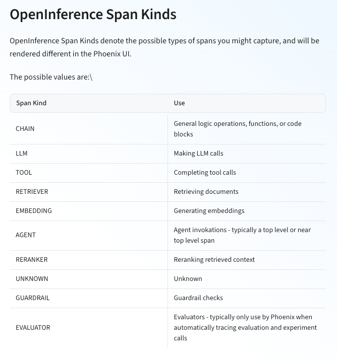 “We emit spans for embedding text to vectors (like”adda”), guardrailing via thinks like guardrals or content moderation, and reranking things via things like cohere. However it’s sorta rare for people to manually write these. We will have decorators for them but right now they are typically emitted from autoinstrumentors like langgraph where there are common patterns for these things. We will have decorators for them very soon - but things like reranking are much more complex than things like tool calling so we are codifying these primitives now.”