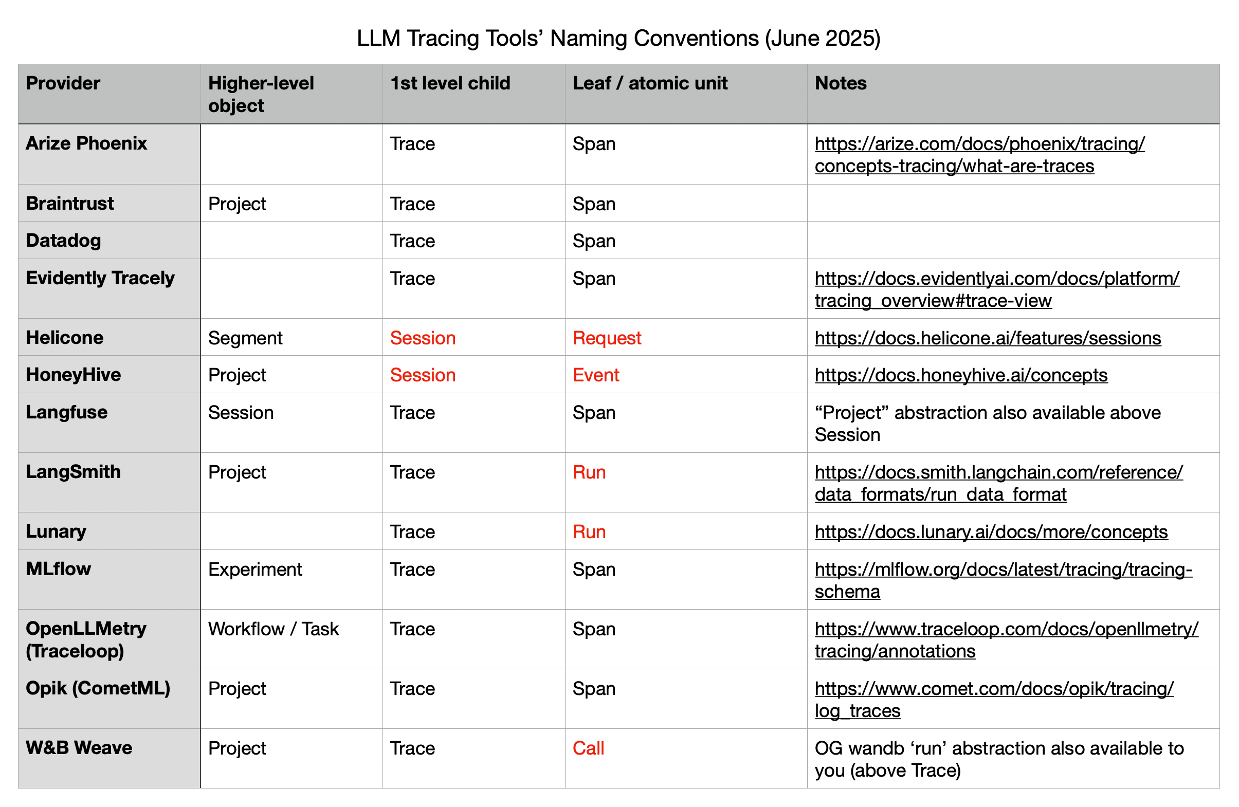 LLM Tracing Tools’ Naming Conventions (June 2025)