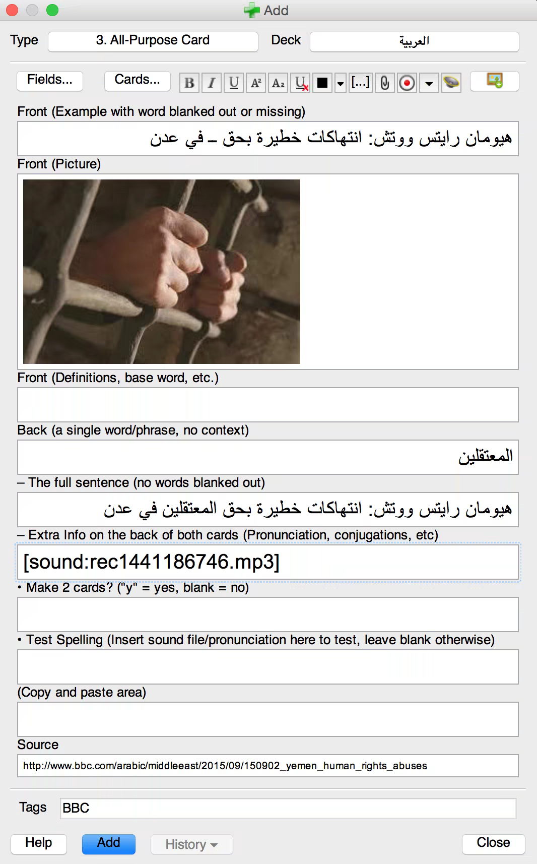 (That card is giving me a picture of a political prisoner along with the context of a sentence in which a word (mu3taqaliin) was originally present; it is my job to remember which word is suitable for that context, prompted by the picture to remind me. Note that the cards are 100% Arabic-only. This is important in general, regardless of the Middlebury language pledge.)