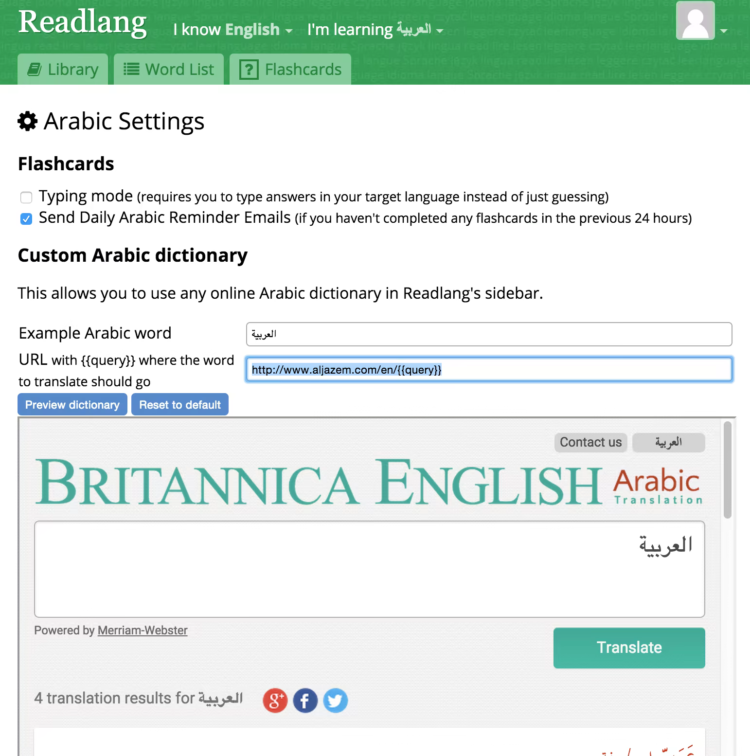 There are some slight amendments I’d recommend for Arabic-learners. If you go to your account settings you’ll have the opportunity to enter in details for a custom Arabic dictionary. Delete whatever is the default there at the moment (probably Google) and use the following text to refill the form.