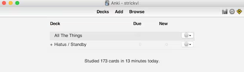 I have one deck (called “All The Things”) which contains all my cards. There is a lot you can do with in-built and plugin support for tags so I’m able to dice and segment the cards as I wish. This means when I’m reviewing my decks, I’ll get one card with Arabic vocabulary one minute, then something testing me on shark anatomy the next, followed by some Python coding-related knowledge I’m learning.