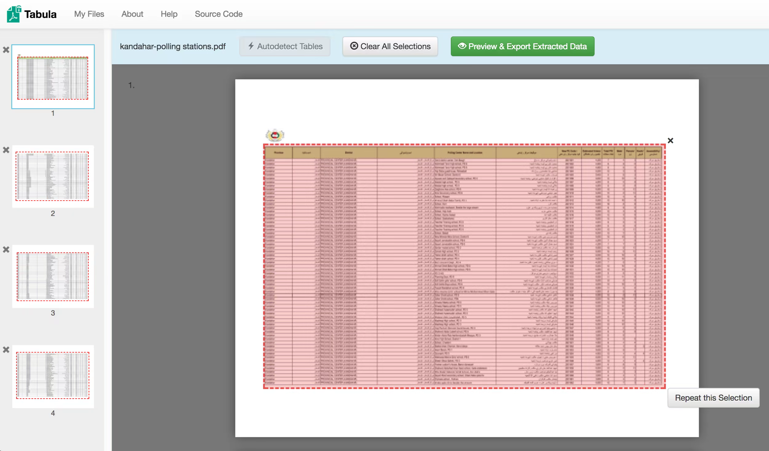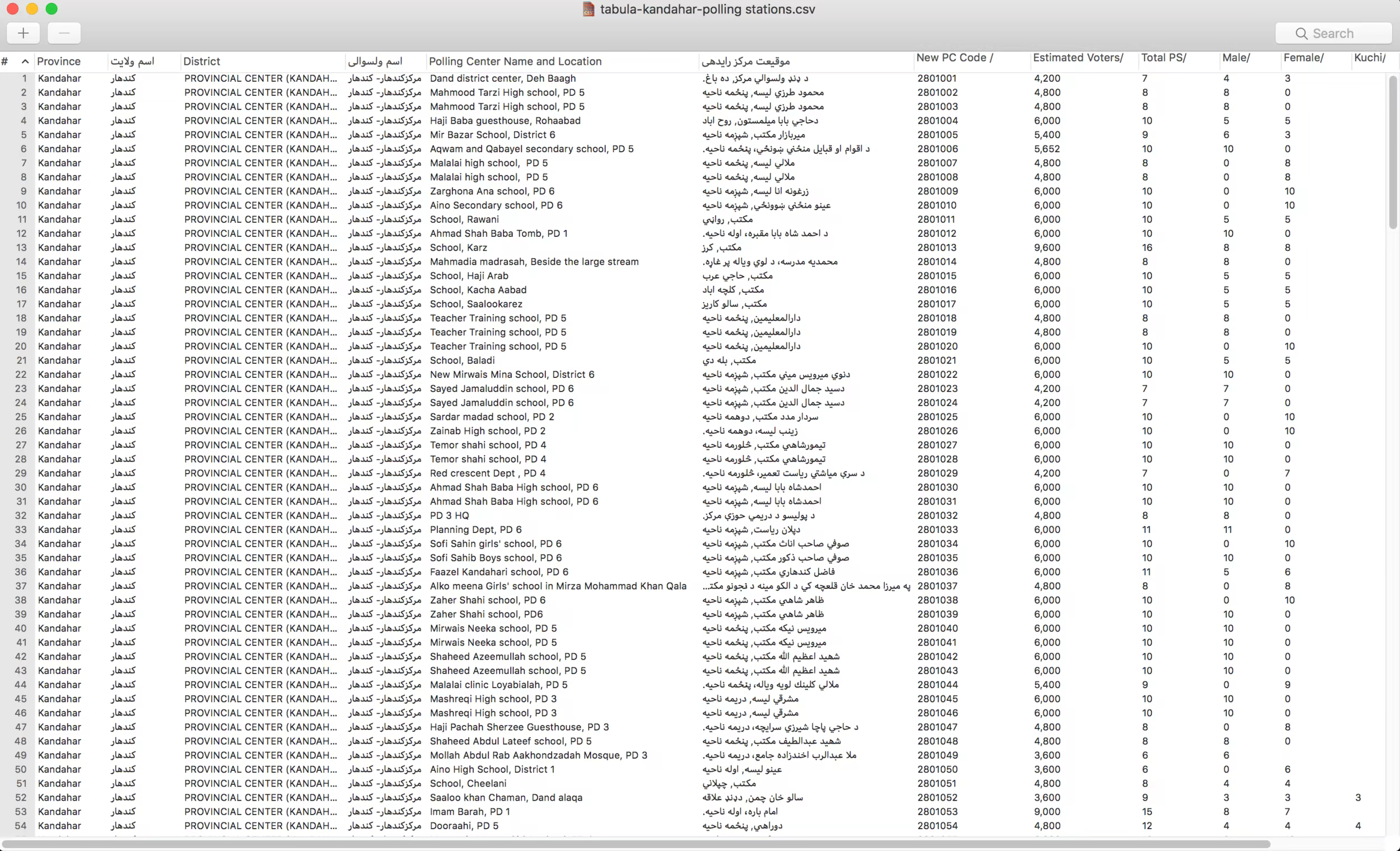 A page listing Kandahar’s provincial council election polling stations from a few years back. Note the use of English and Dari scripts. Tabula handles all this without problems. [/caption]