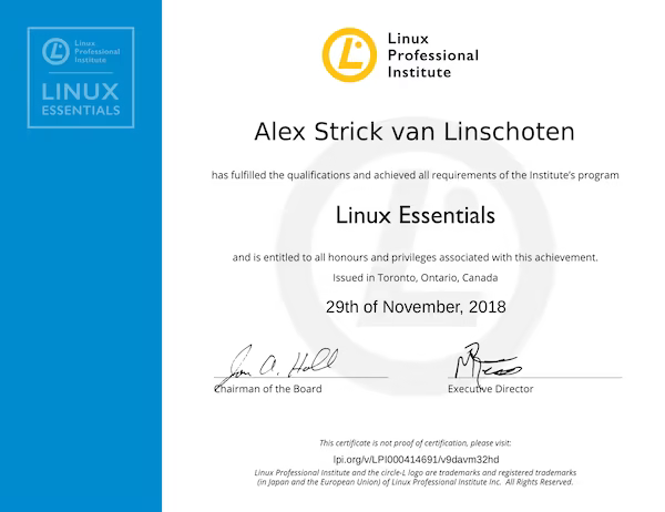 LPI is the Linux Professional Institute. They are the gatekeepers to a number of different Linux certifications (and, coming soon, BSD certifications as well!). The Linux Essentials syllabus gave a good grounding in the history around Linux as an operating system, a number of core UNIX tools, and a basic overview of some things going on under the hood. Some of it was easy / familiar, but I’m glad I went through this systematically.